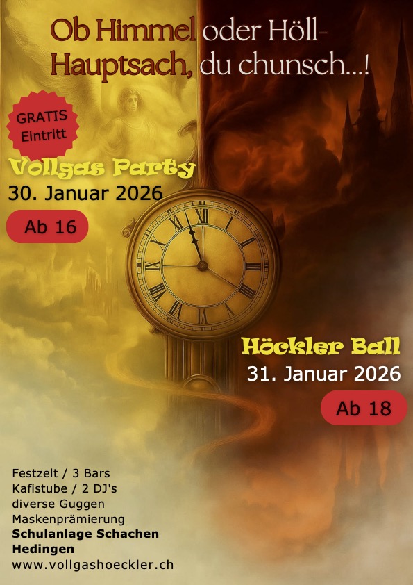 Unter dem Motto „Ob Himmel oder Höll – Hauptsach, du chunsch...!“ wird in Hedingen wieder gefeiert, getanzt und geguggt, bis die Halle bebt.